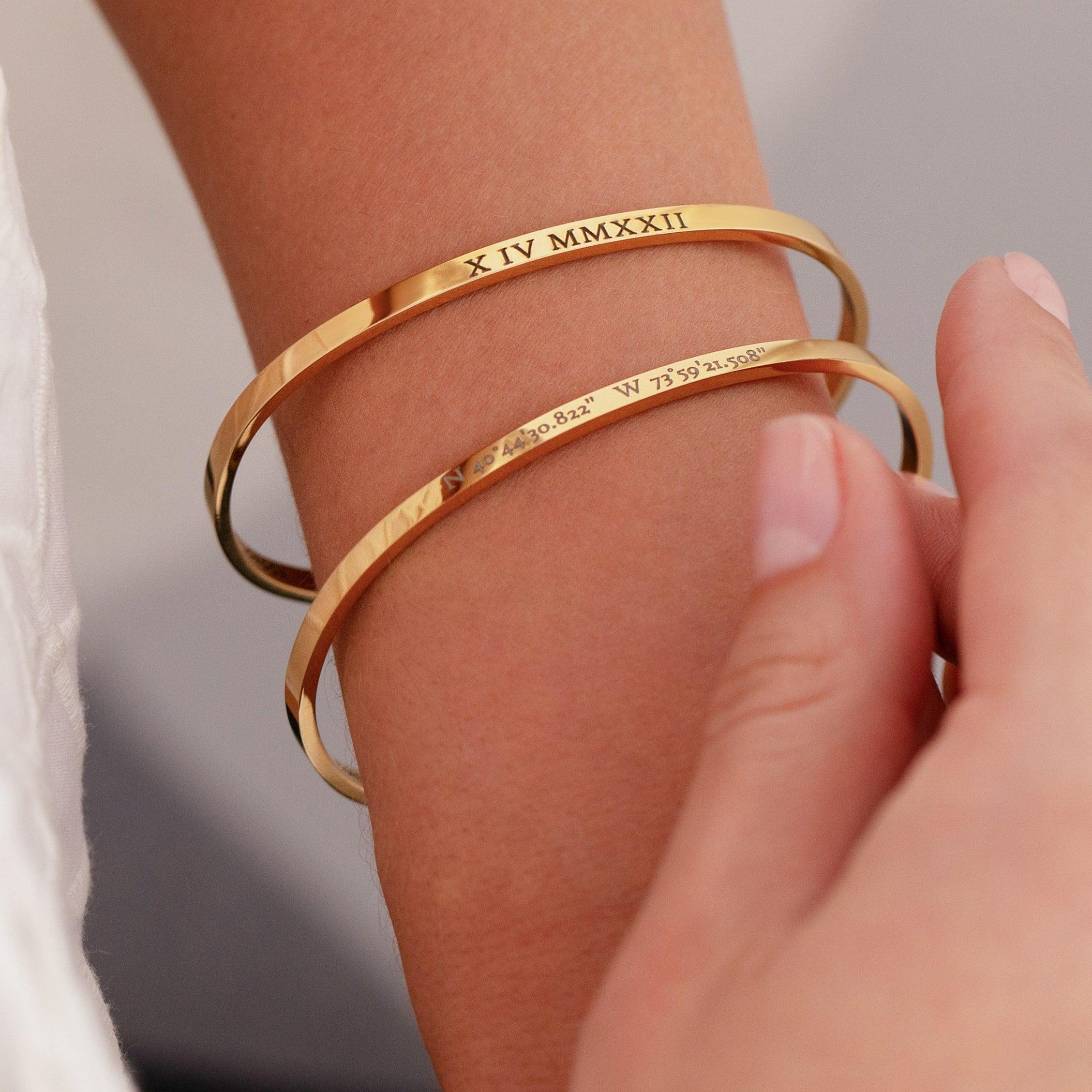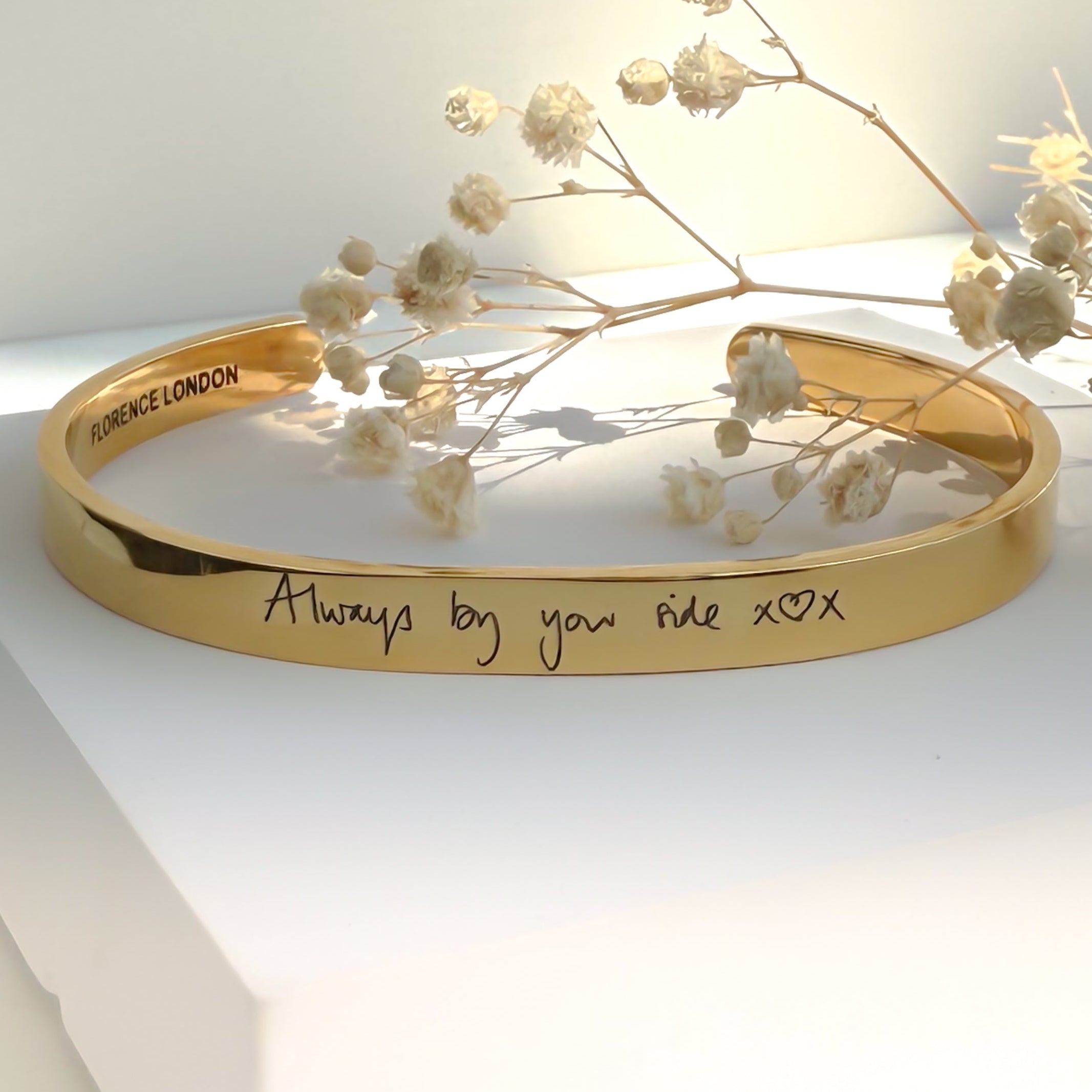 Discover heartfelt personalised Mother's Day jewellery gifts in the UK from Florence London. Engrave names, handwriting, or fingerprints on gold bangles and necklaces – perfect for showing love this March....