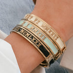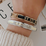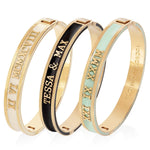 Our signature style bangle with a clasp on the side and a pretty line of enamel on the edge. These stunning bangles are personalised by hand with family names, birthdays, anniversary dates and messages.