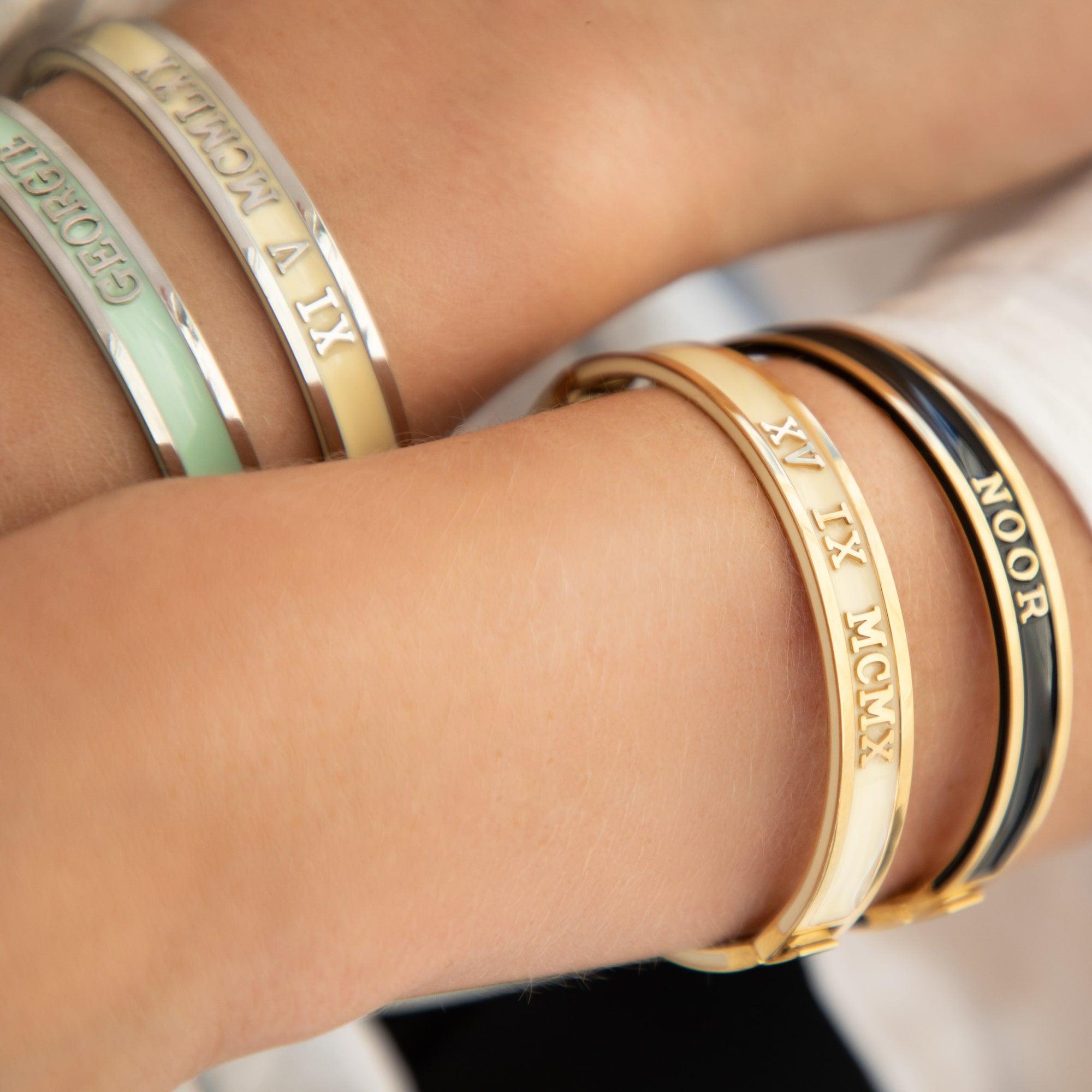 Our signature style bangle with a clasp on the side and a pretty line of enamel on the edge. These stunning bangles are personalised by hand with family names, birthdays, anniversary dates and messages.