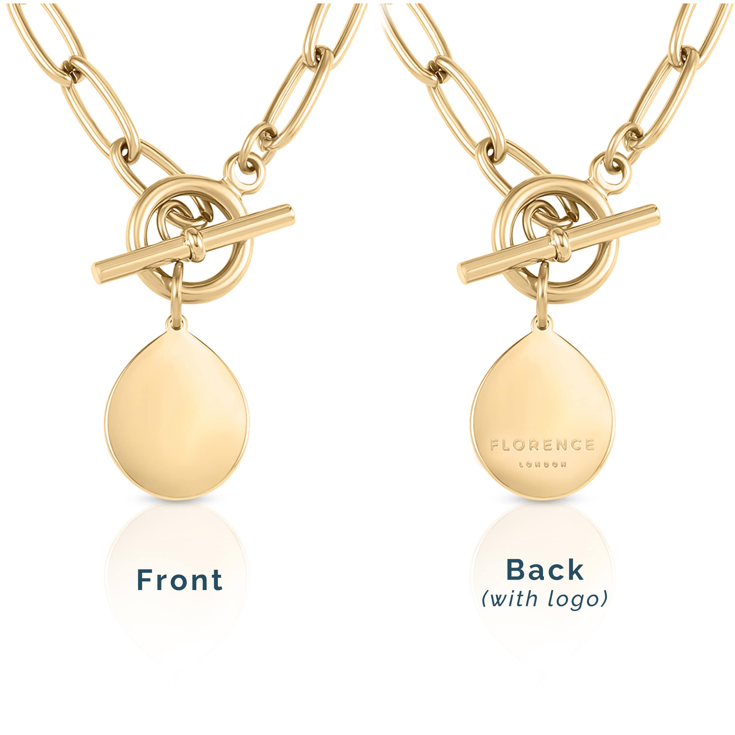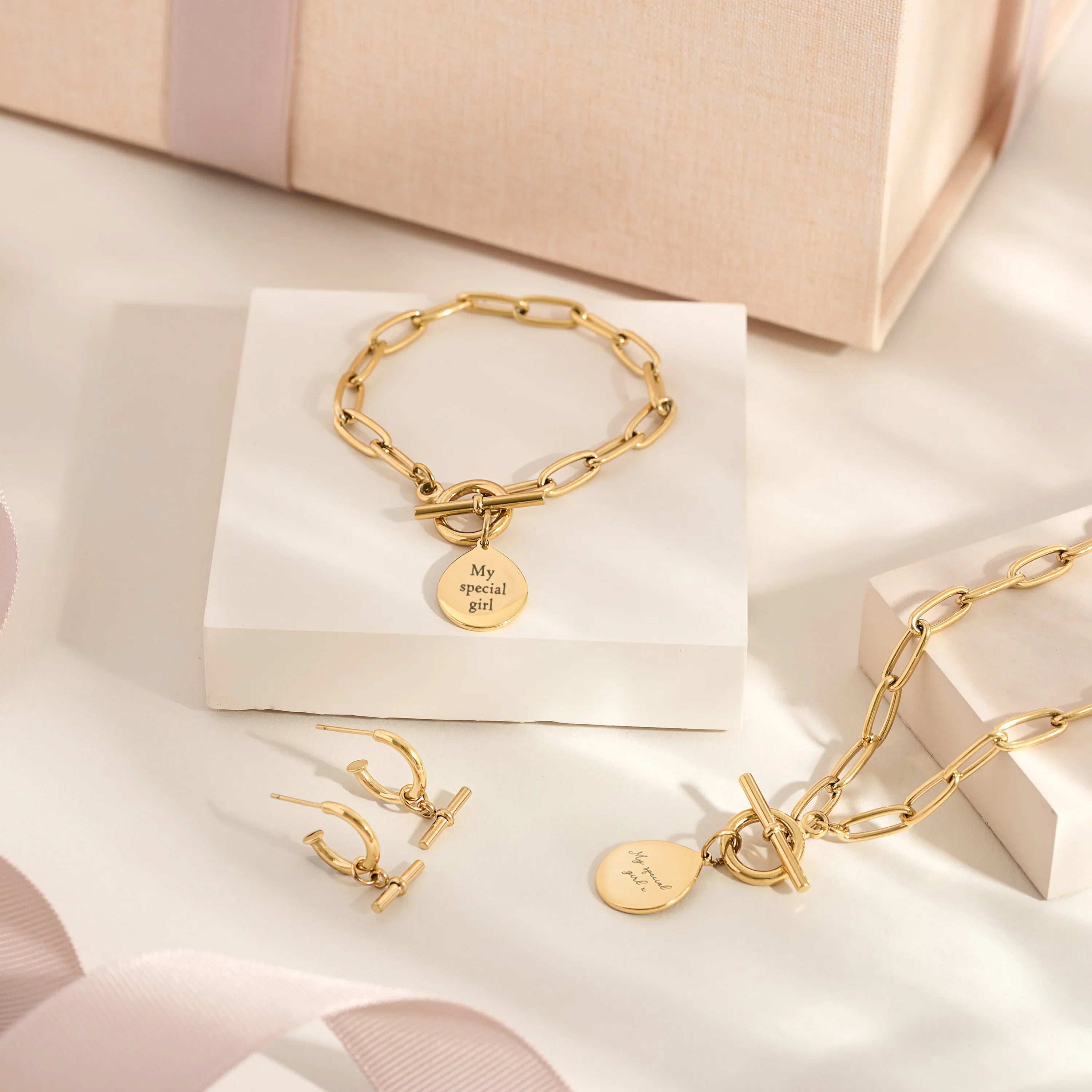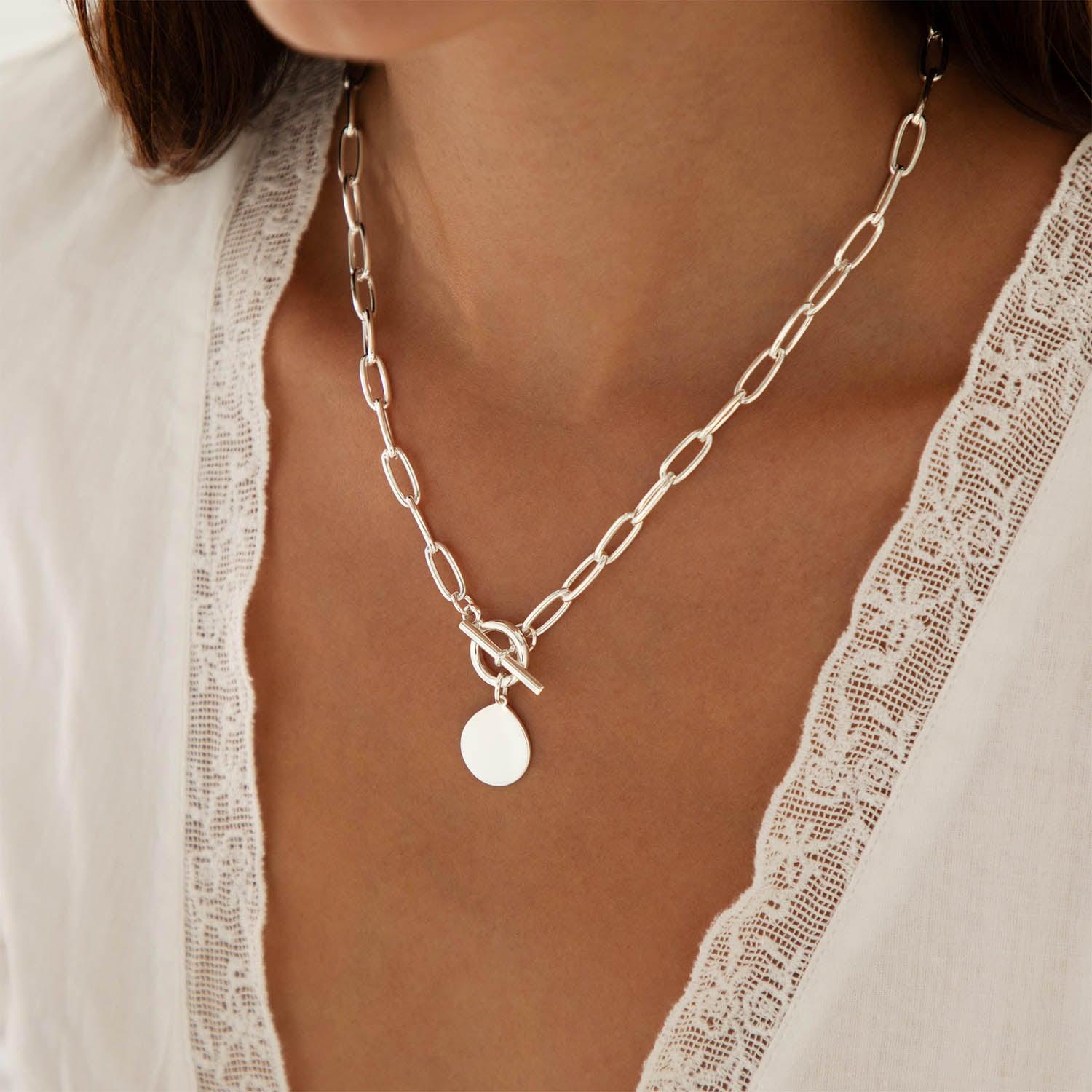 A chunky chain with an easy T Bar fastening and a pretty pendant that can be engraved with meaningful names, dates and initials.