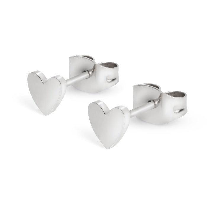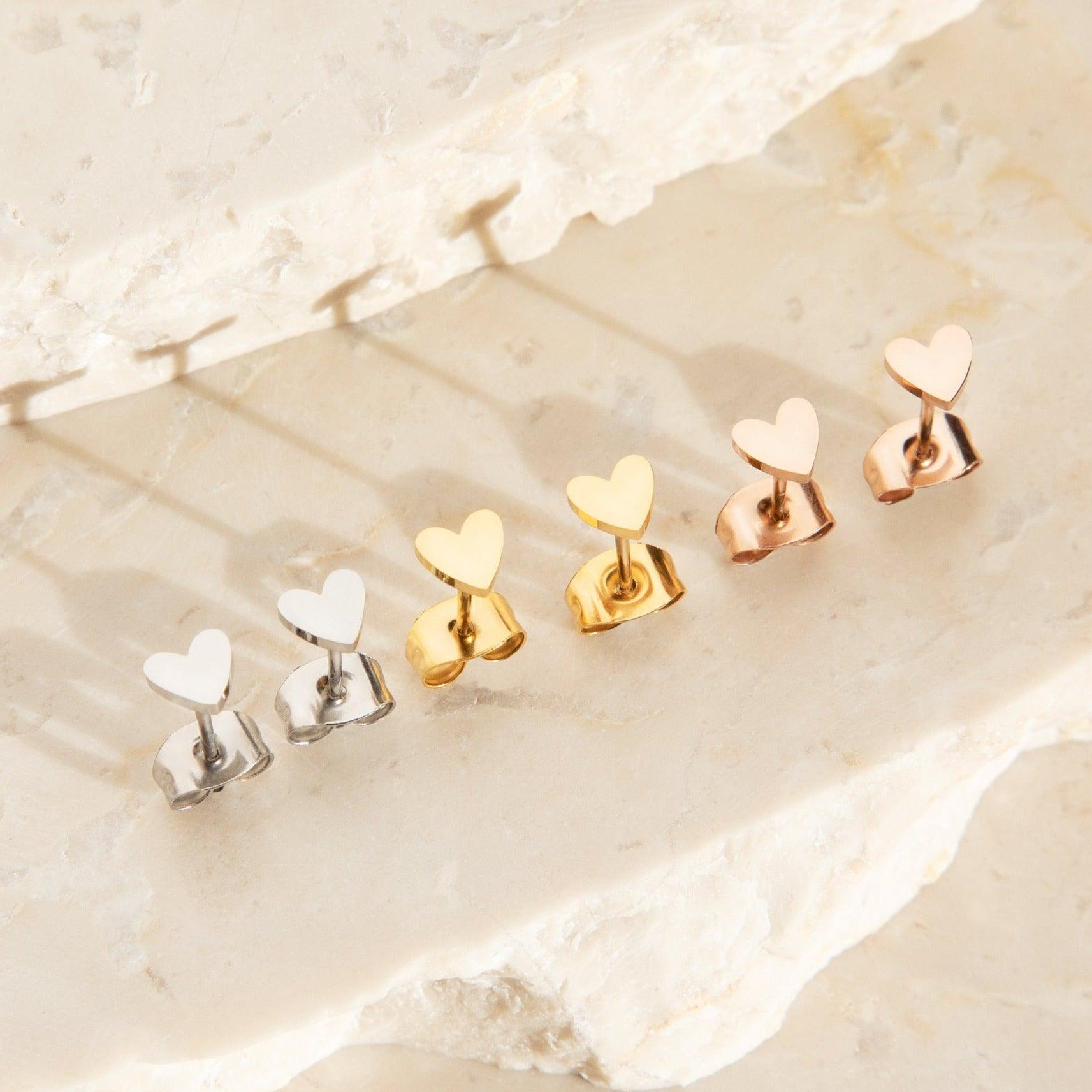 A pair of tiny heart studs in gold, rose gold or silver. These earrings can be worn alone or stacked with our Little Letter Earrings or Letter Hoop Earrings.