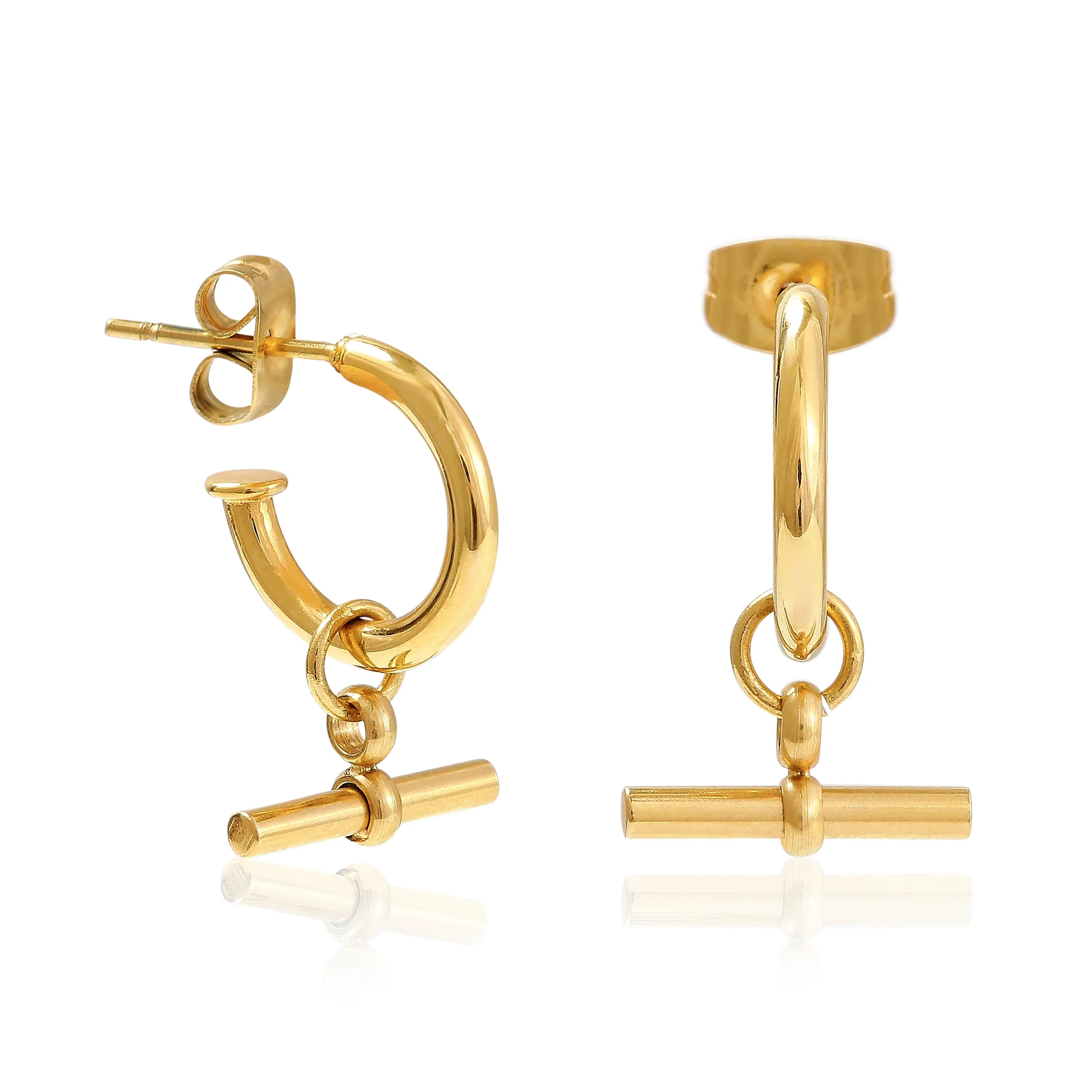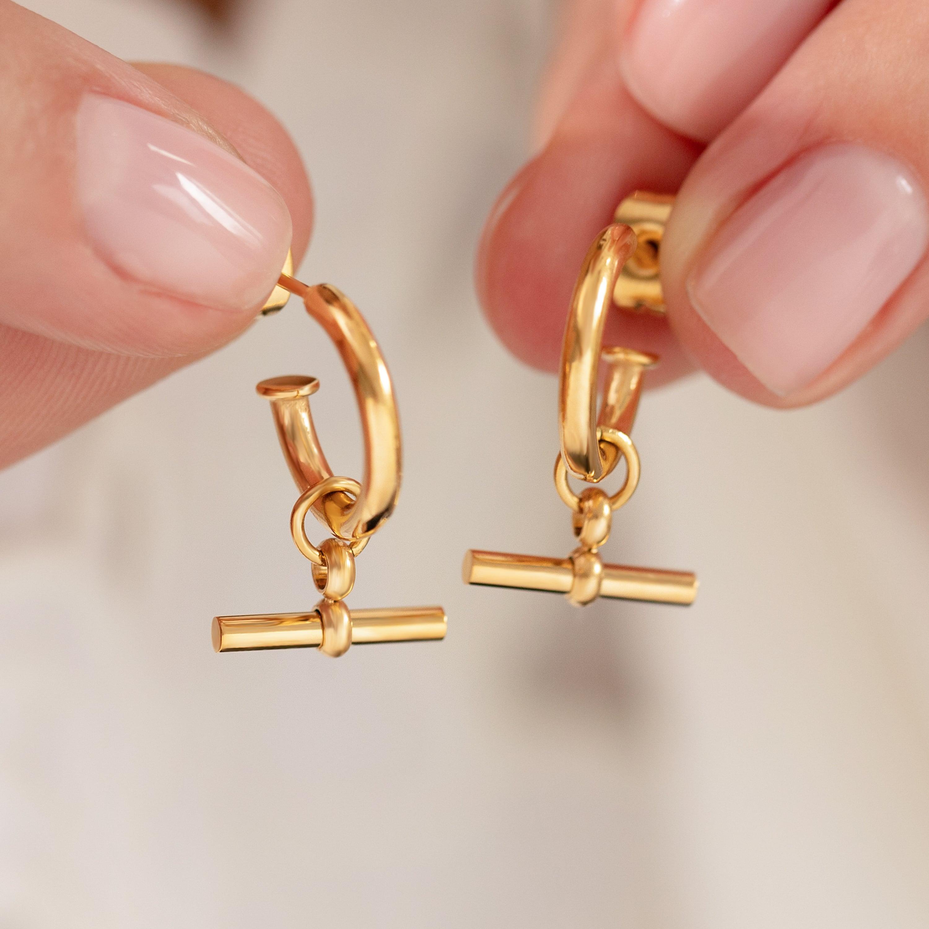 Our T-Bar hoop earrings are the perfect size for everyday wear or stacking with studs, larger hoops and smaller huggies. The little T bar can slide on and off the hoop to be used on a necklace chain as a little pendant to change up your look.