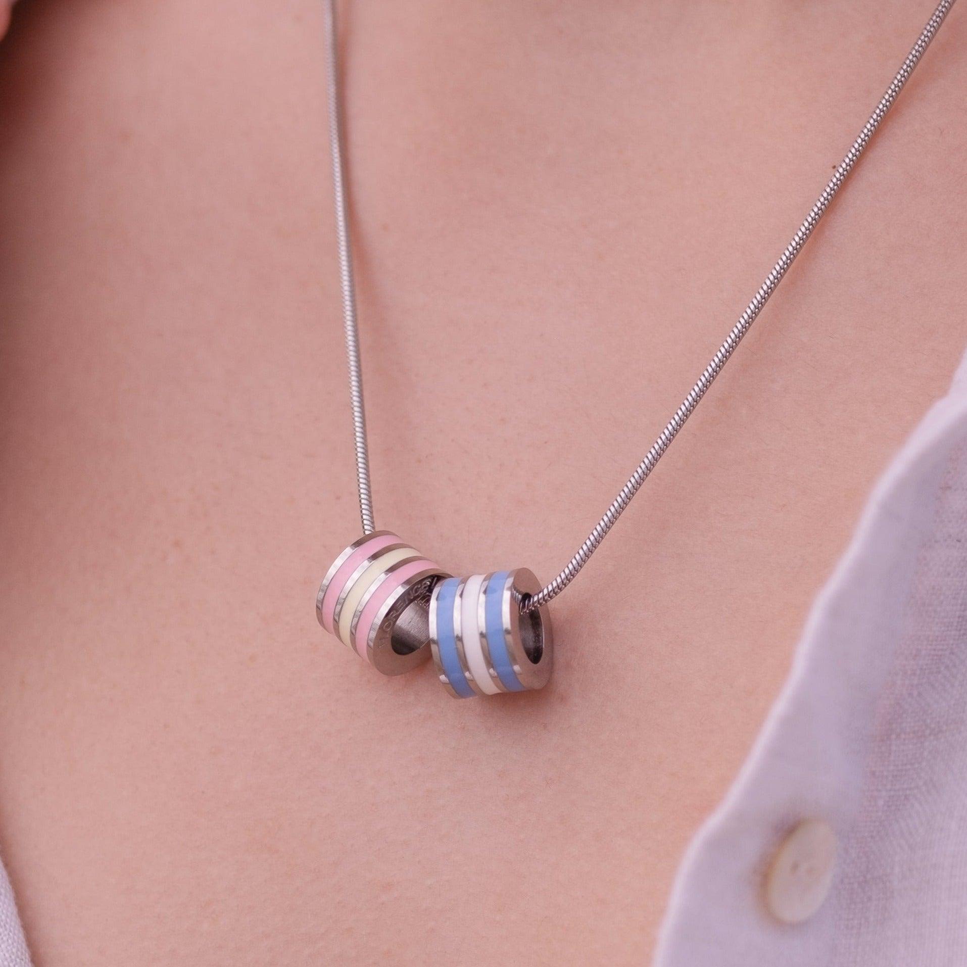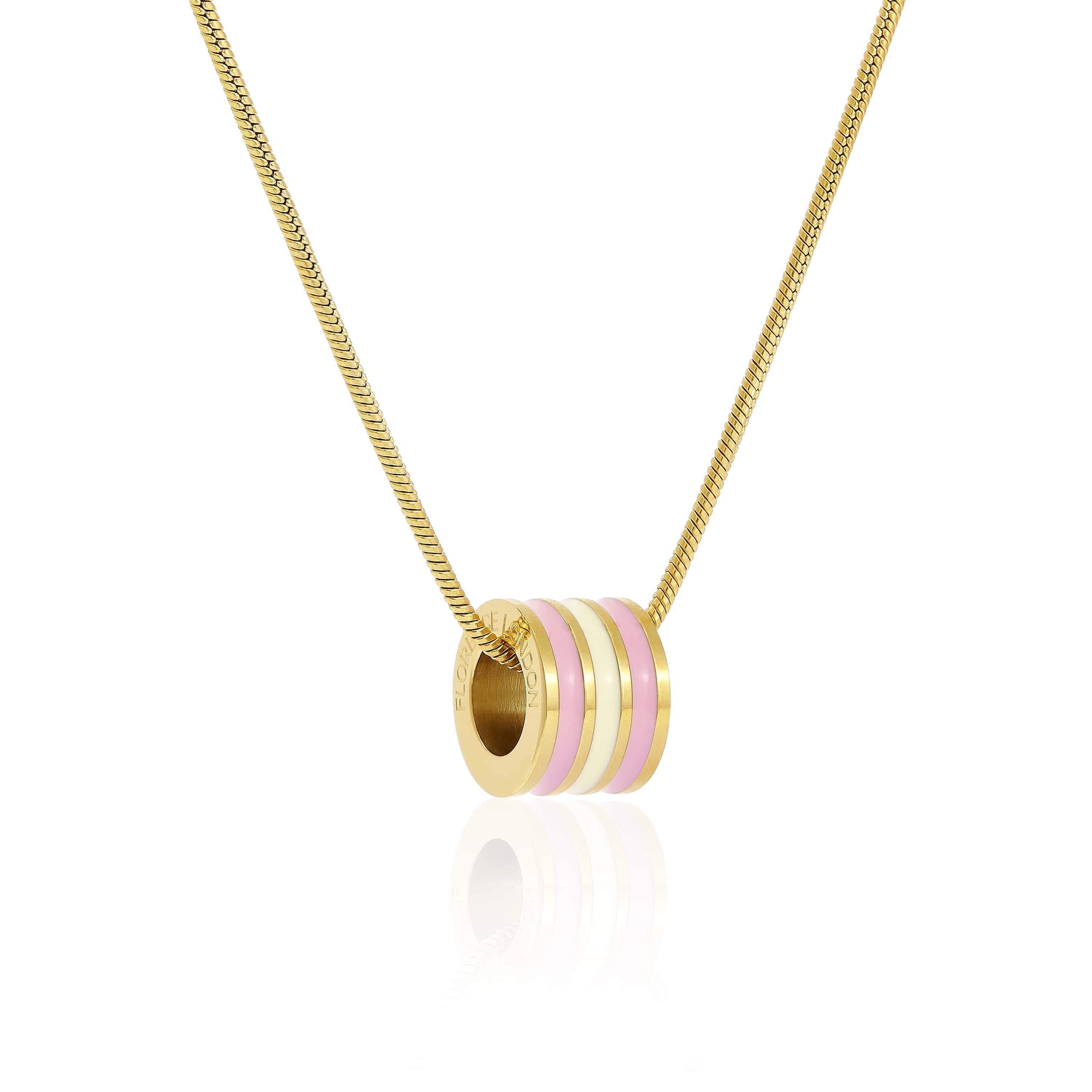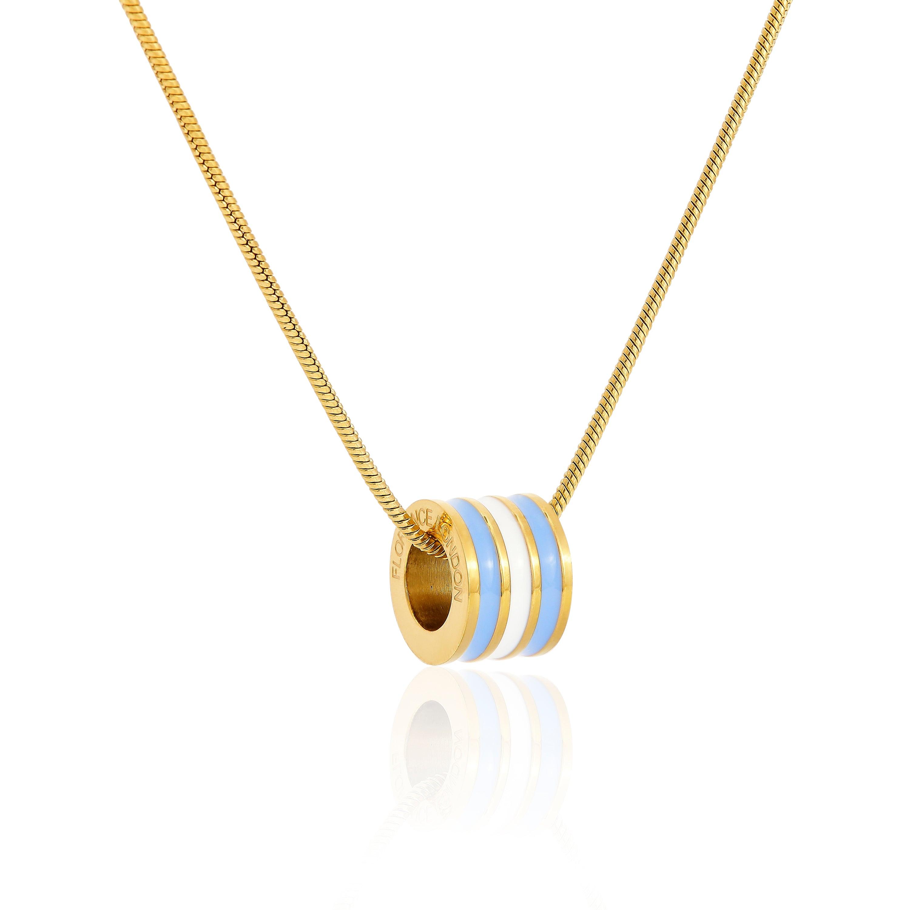 Our signature necklace now in a new design - an enamel barrel in blue or pink stripes. The perfect summer piece.