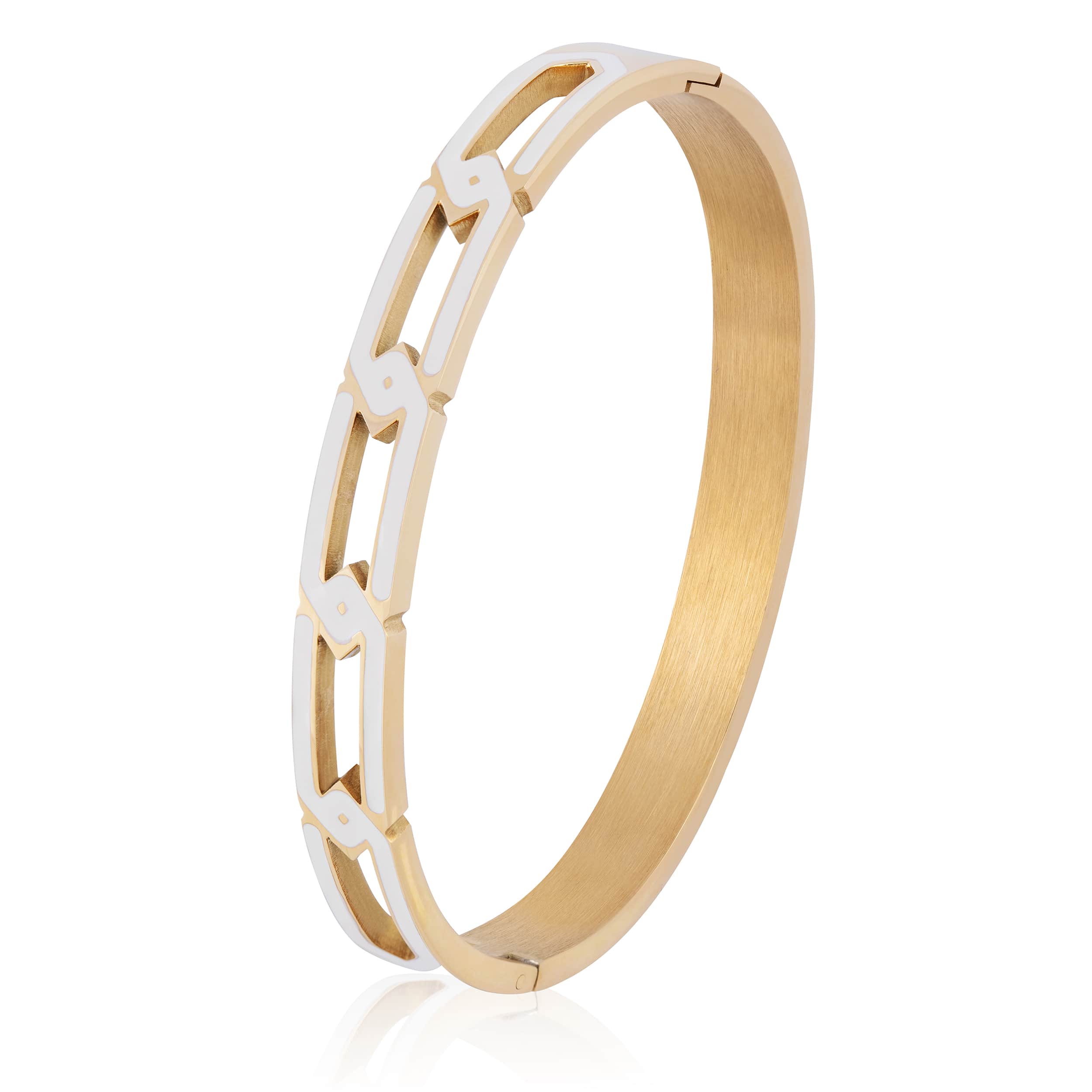 The Eternity Bangle features a beautiful Greek interlocking design signifying unity.