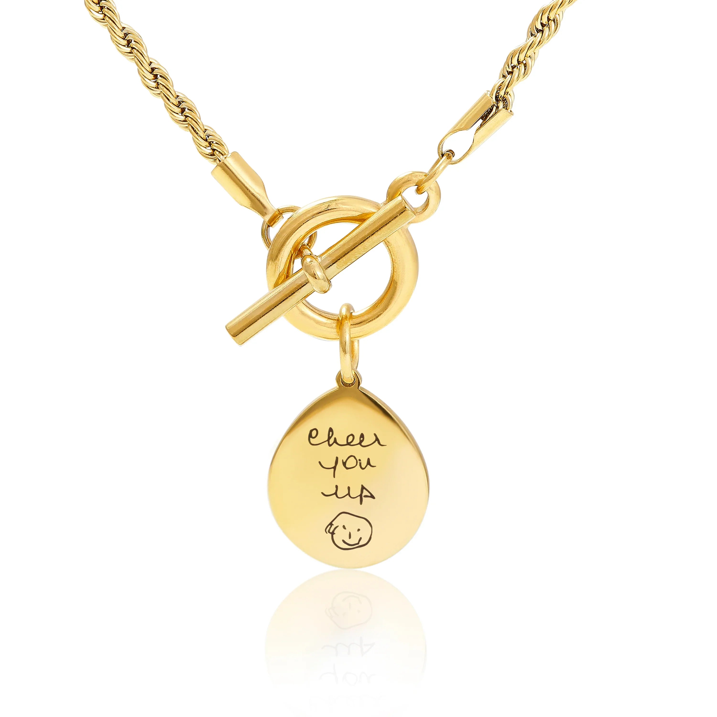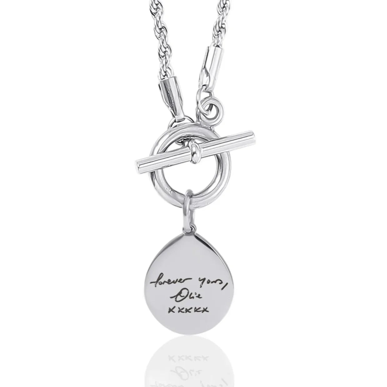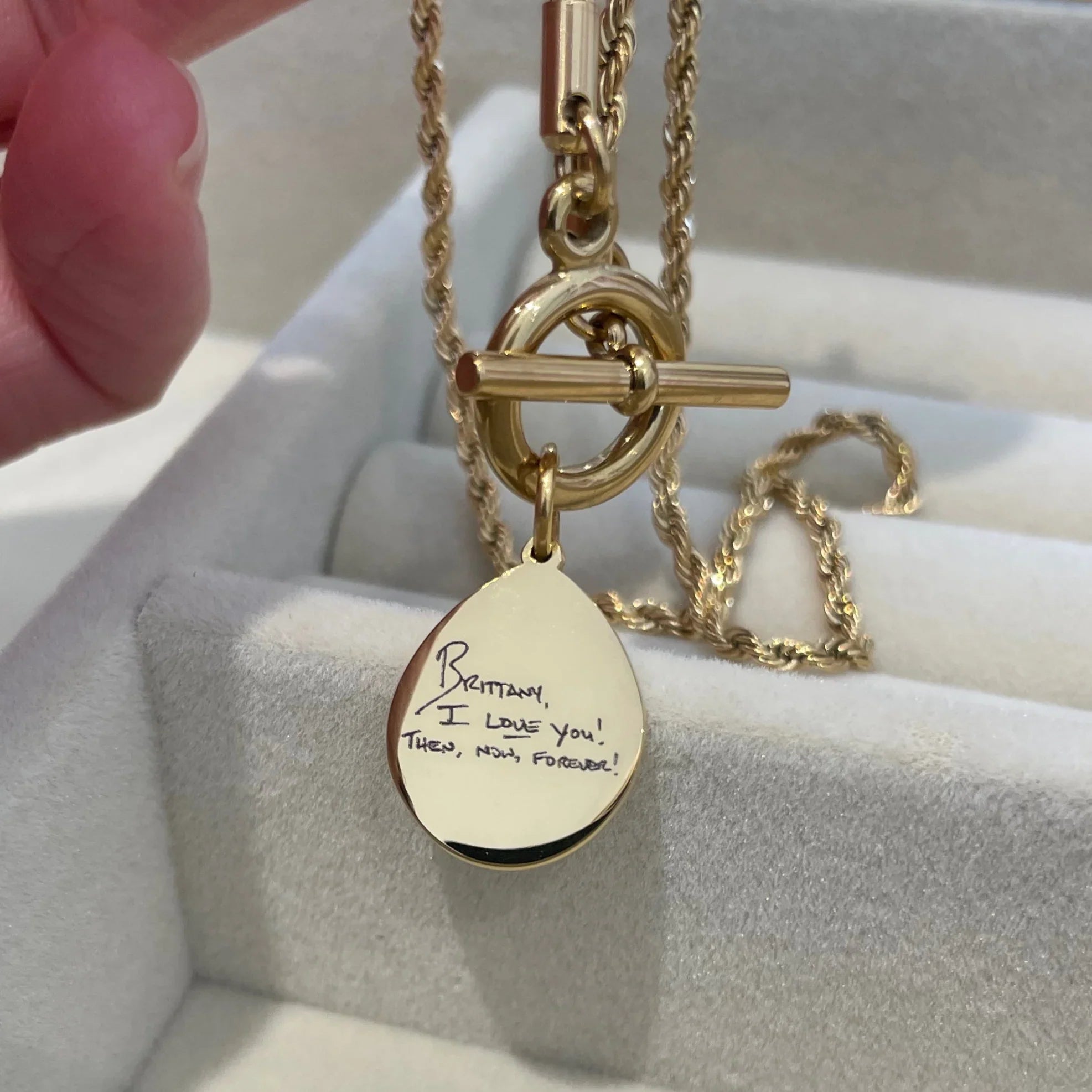 Engrave a loved ones handwriting forever with this stunning necklace. Upload a picture of their writing from a greetings card, letter, doodle or note and we will turn your file into a beautifully engraved piece of jewellery.