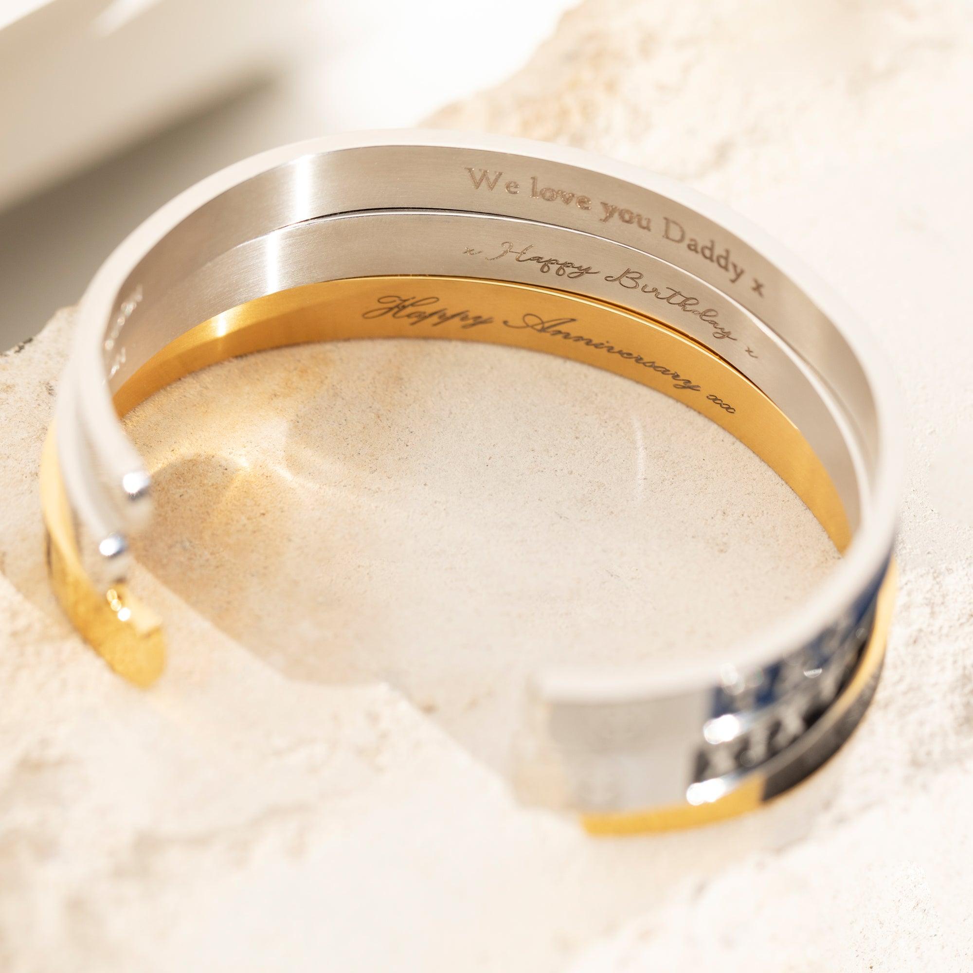 Our Signature Initial Cuffs are designed with flexibility to fit all wrist sizes. Inside engraving is an optional extra. They are 100% waterproof.