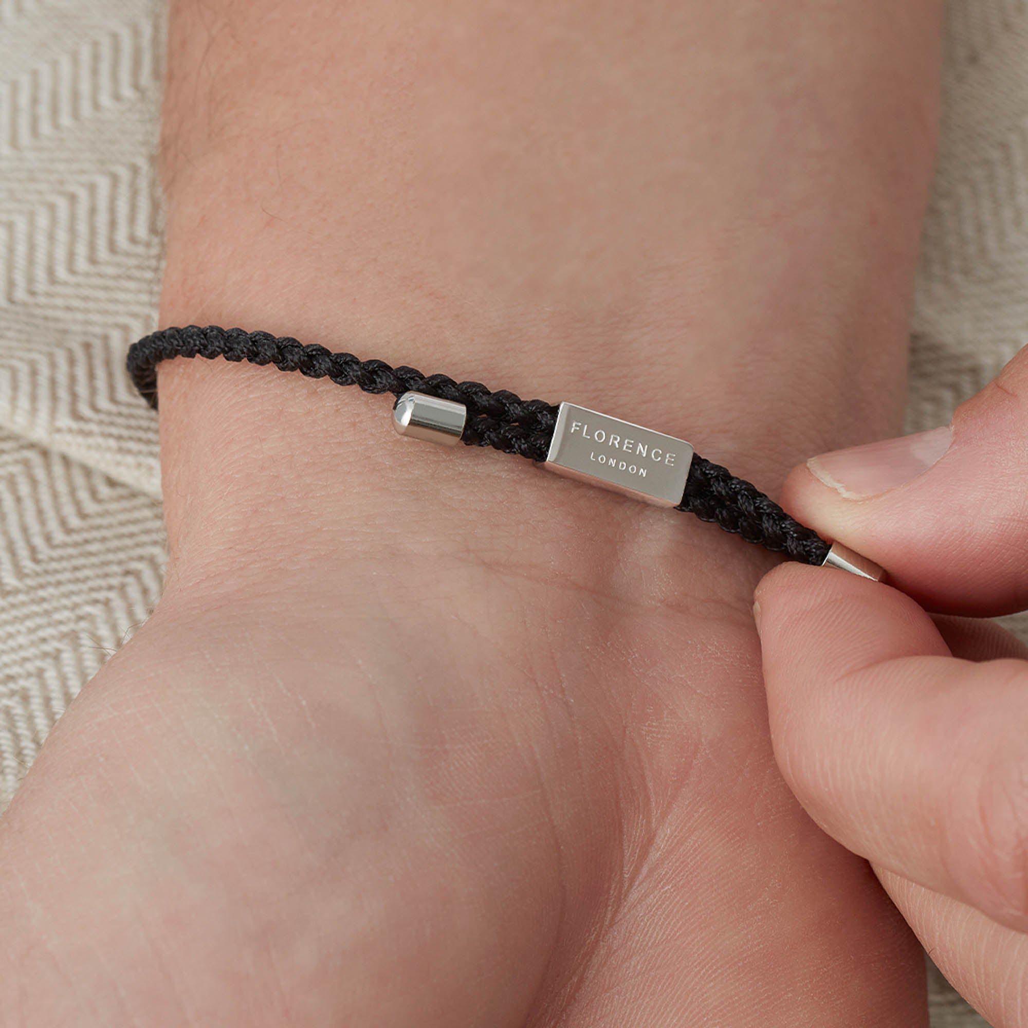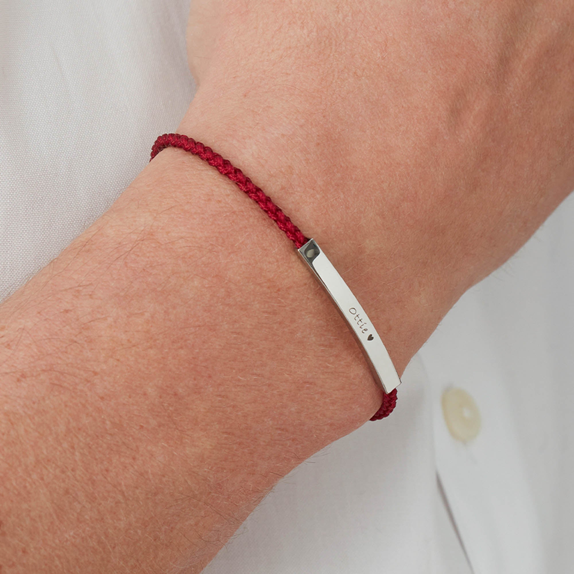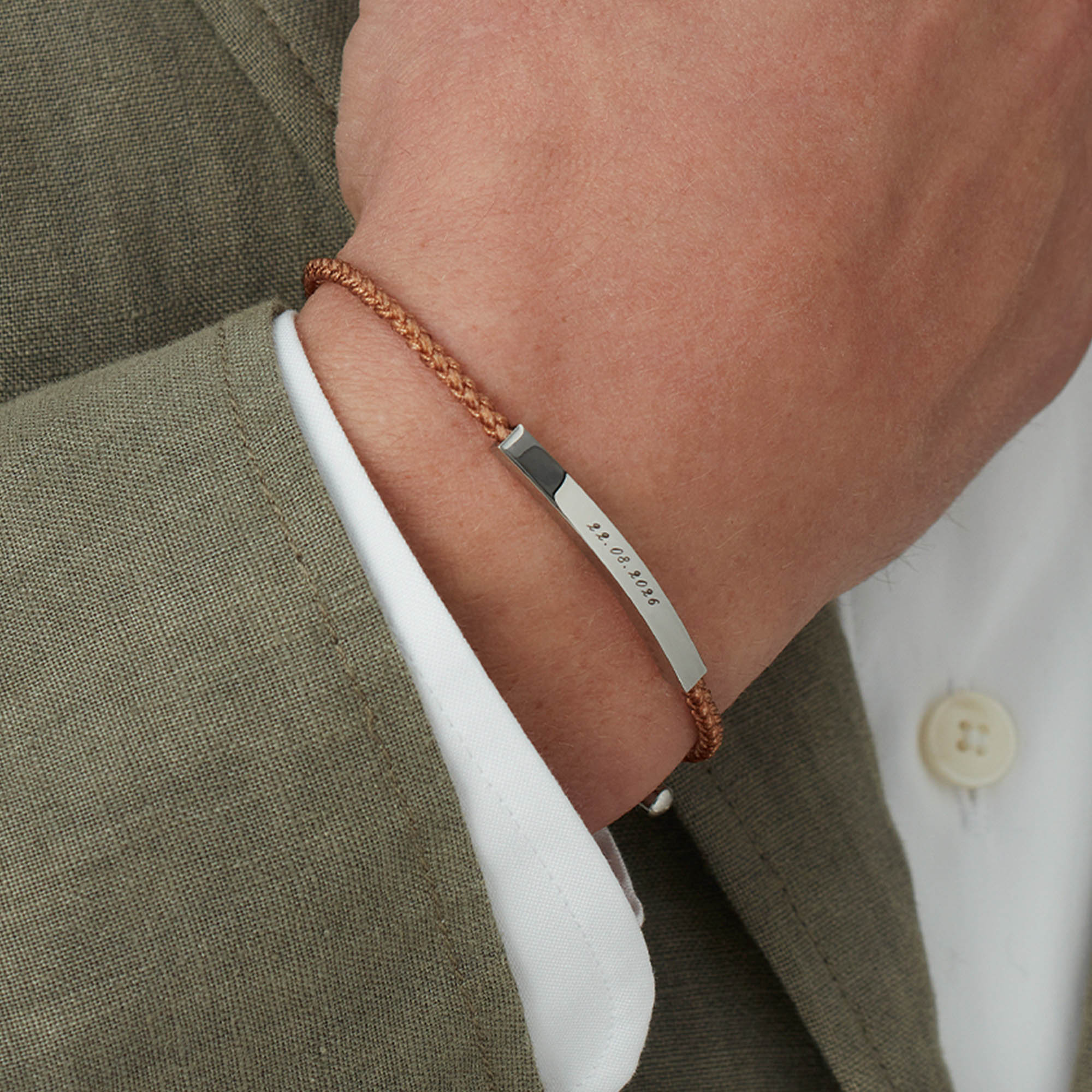 A rope bracelet  in three colours with an adjustable toggle and an engraved bar.
