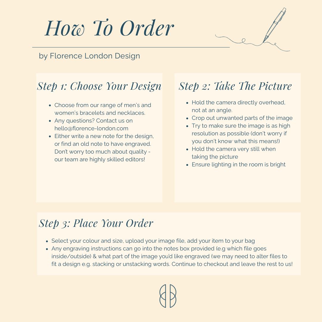 Engrave a loved ones handwriting forever with this stunning necklace. Upload a picture of their writing from a greetings card, letter, doodle or note and we will turn your file into a beautifully engraved piece of jewellery.