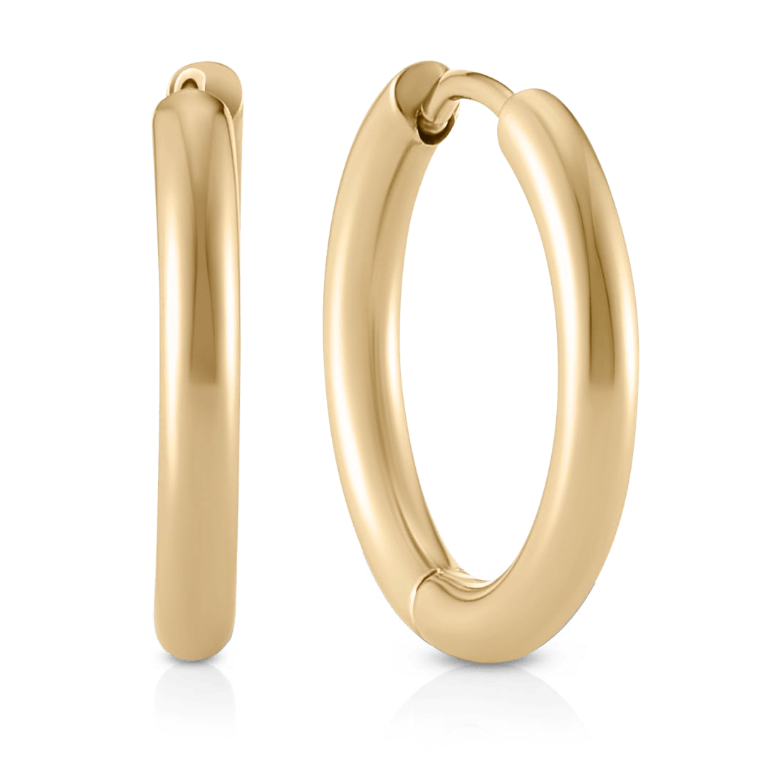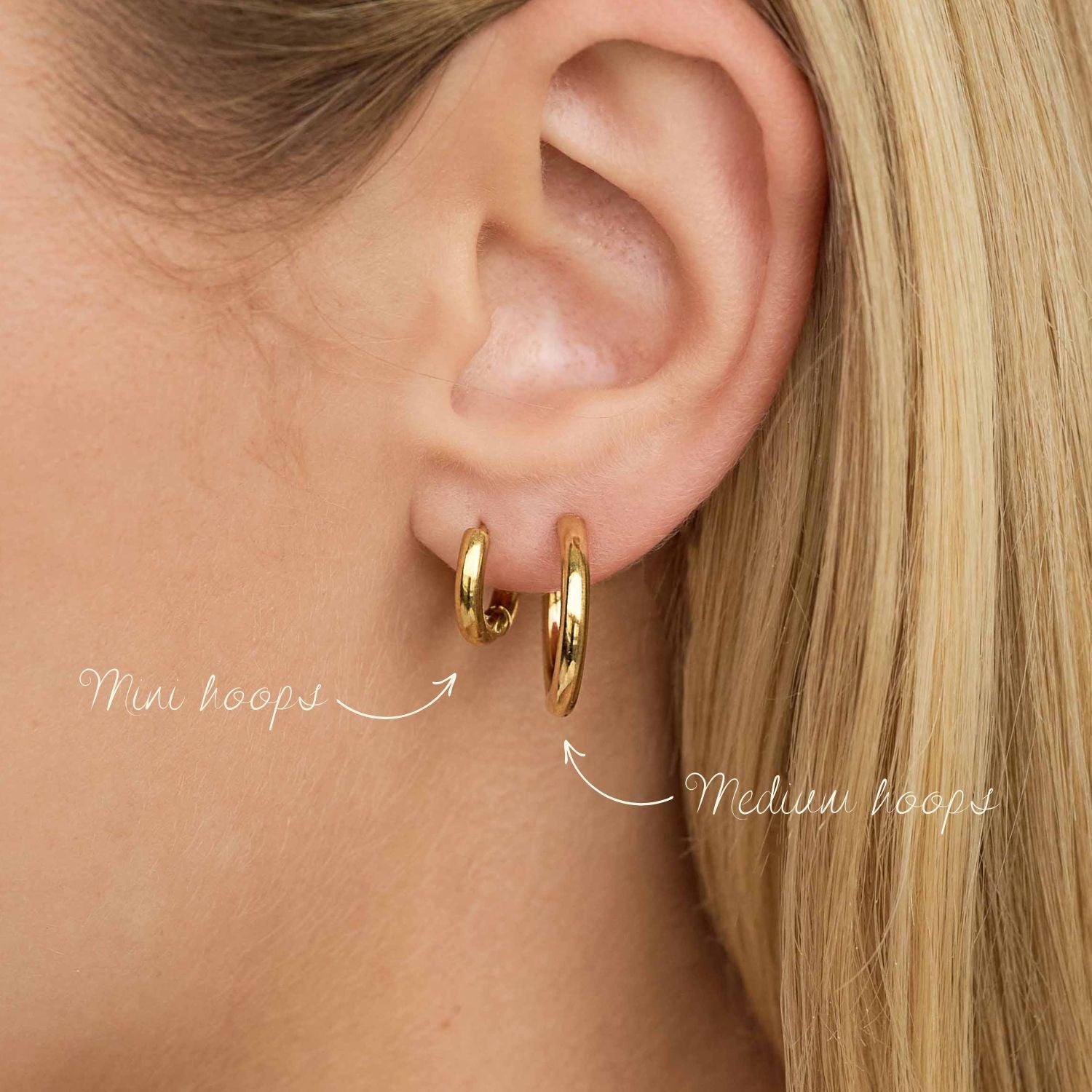 Medium sized gold hoops perfect for stacking, in the first or second hole. 19mm outer diameter. Sold as a pair.