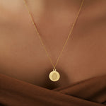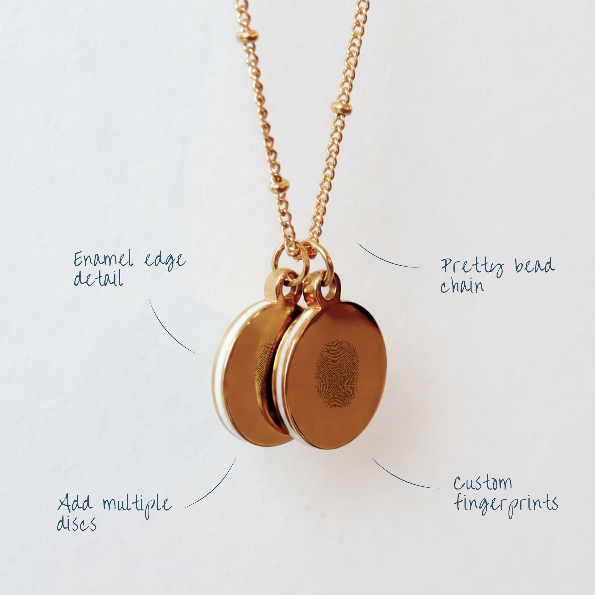 A 15mm disc pendant on a 47cm bead chain, engraved with real fingerprints. 18ct gold or platinum silver finish.