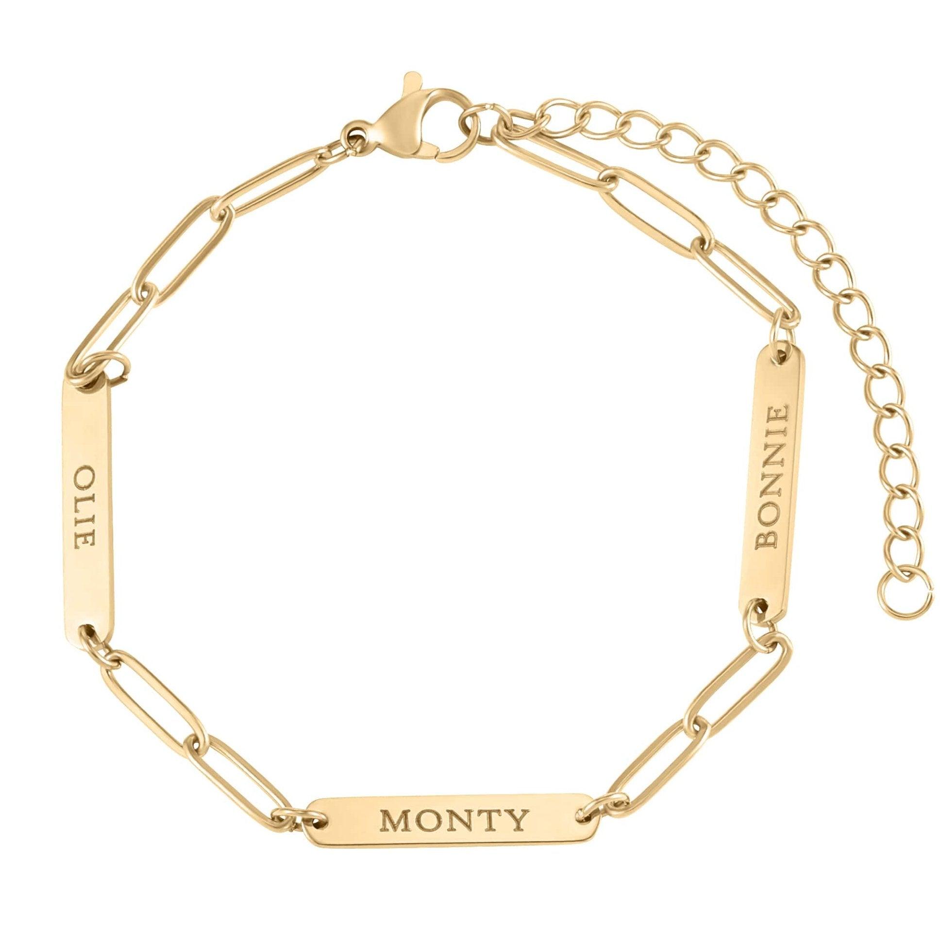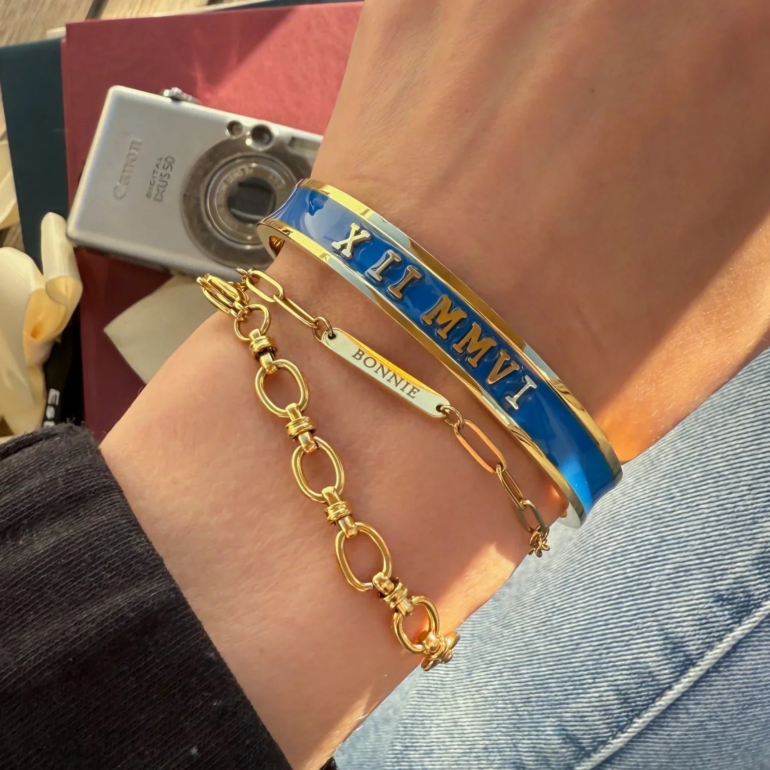 A sweet three-bar bracelet on a mini paperclip chain. Personalised with names, dates or initials on each bar. These gold or silver chains layer beautifully with our solid oval or round bangles.