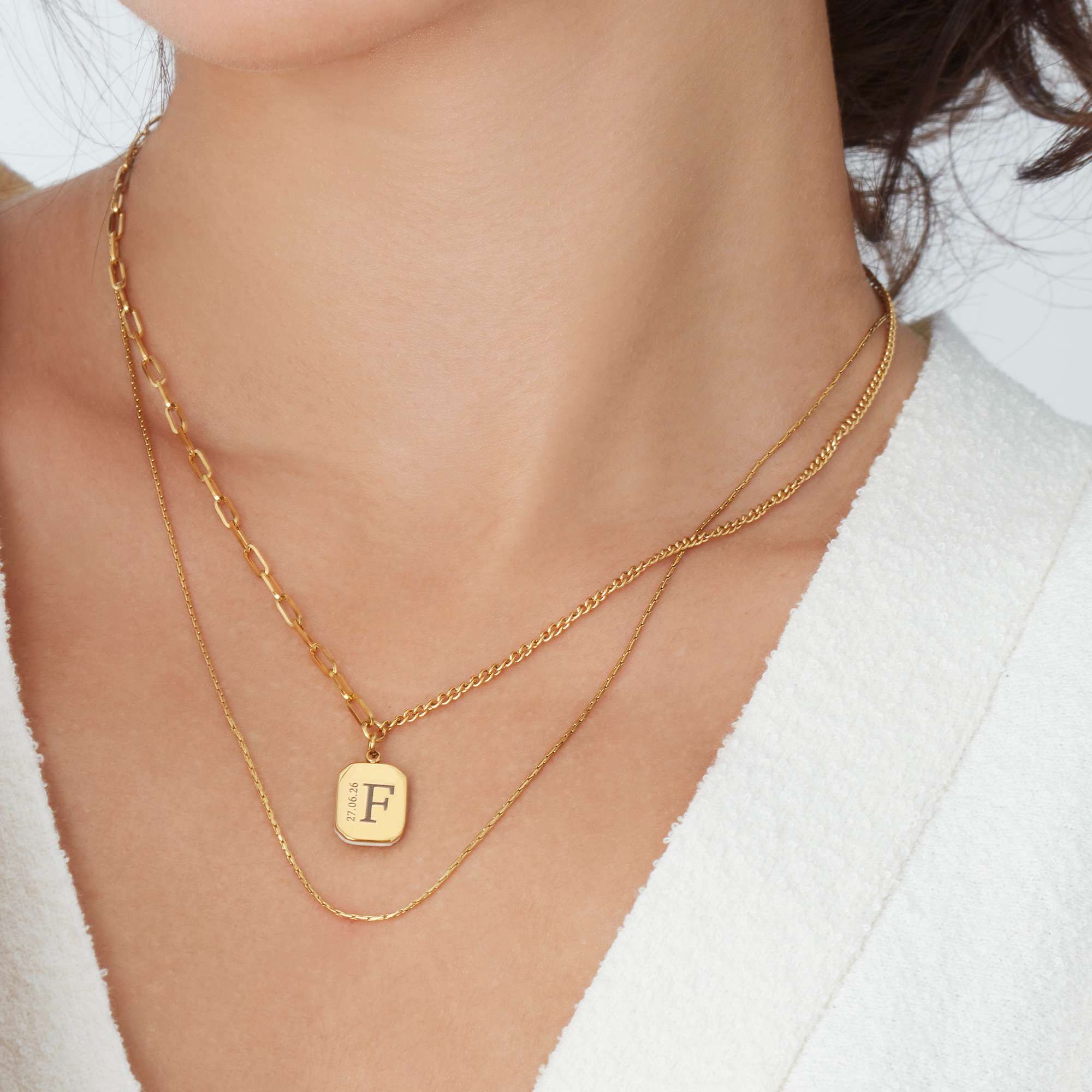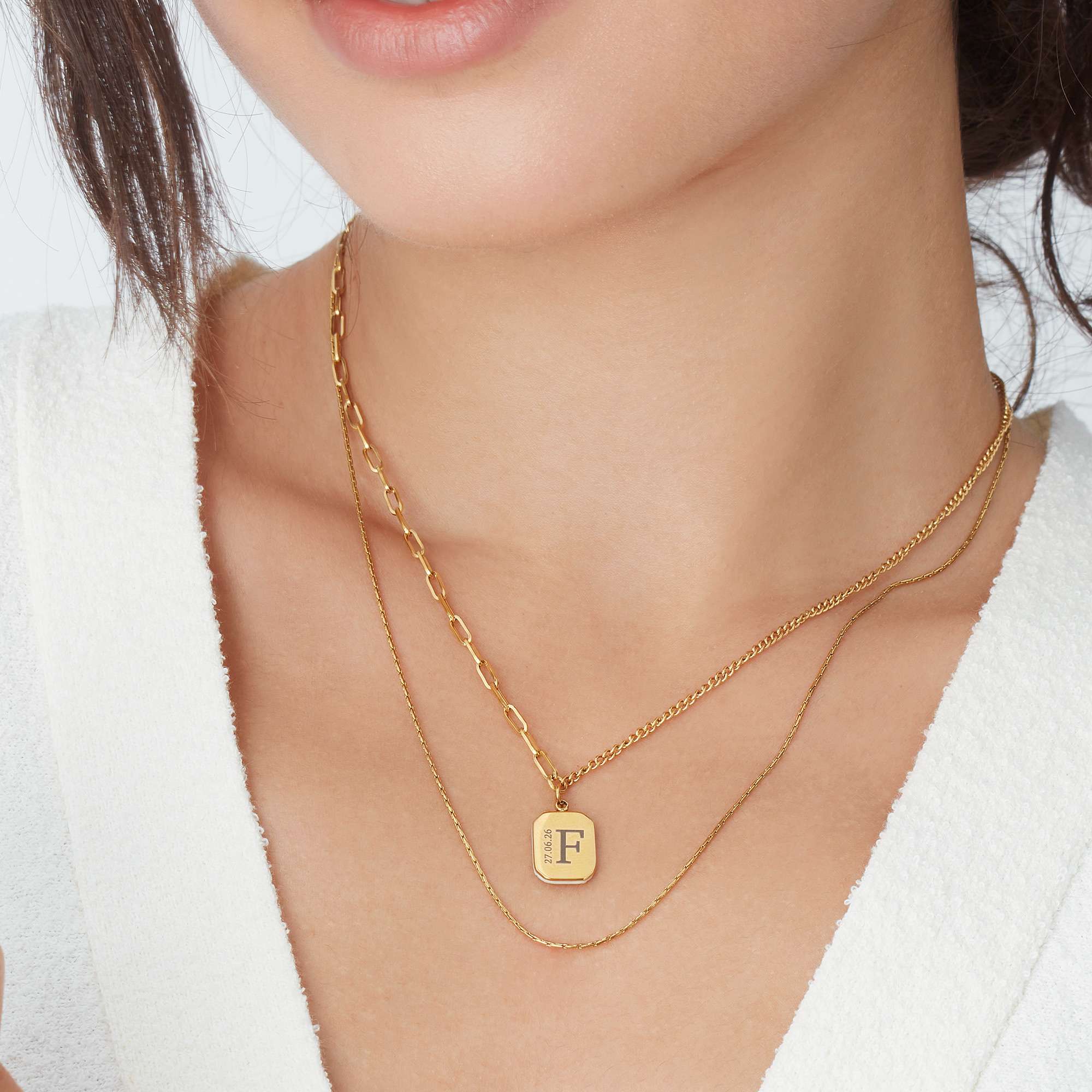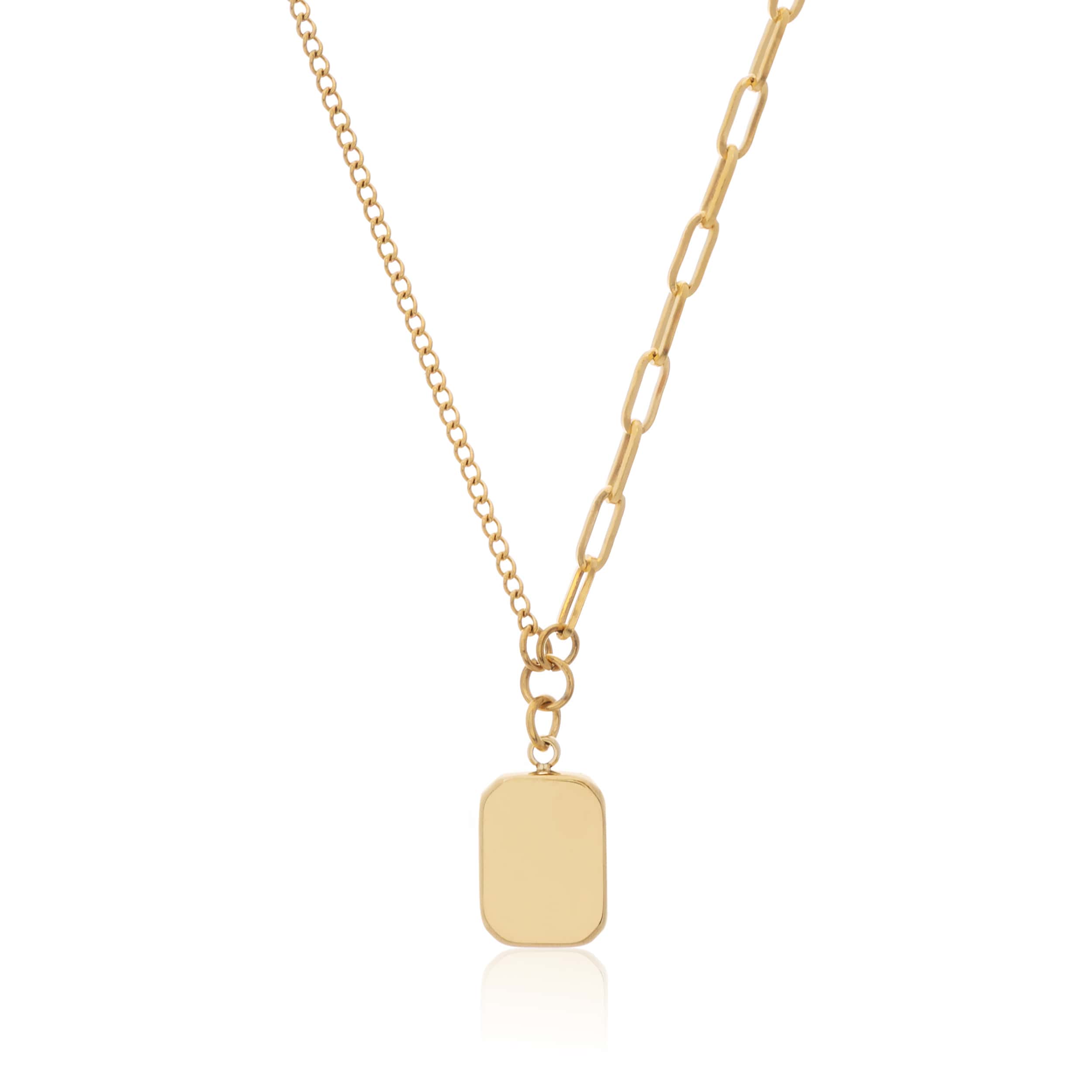 The pendant sits on a multi design chain, half a dainty paperclip deign and half cable.