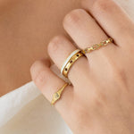 Our rings are made from luxurious 18ct gold plate that never tarnishes even throughout years of daily wear. We also use tarnish resistant, lead-free stainless steel on the base for its durability and ease of care. This wonderful combination has been an incredible success for us since it will not oxidise or turn skin green! Our jewellery does not contain brass or nickel.
