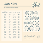 Available in sizes L (16.51mm), N 1/2 (17.32mm), P 1/2 (18.14mm) or R 1/2 (19.95mm). Ring sizers are available.