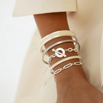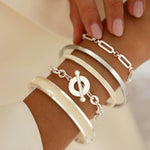 This chunky, statement bracelet offers complimentary engraving on the halo that supports it's T Bar fastening.