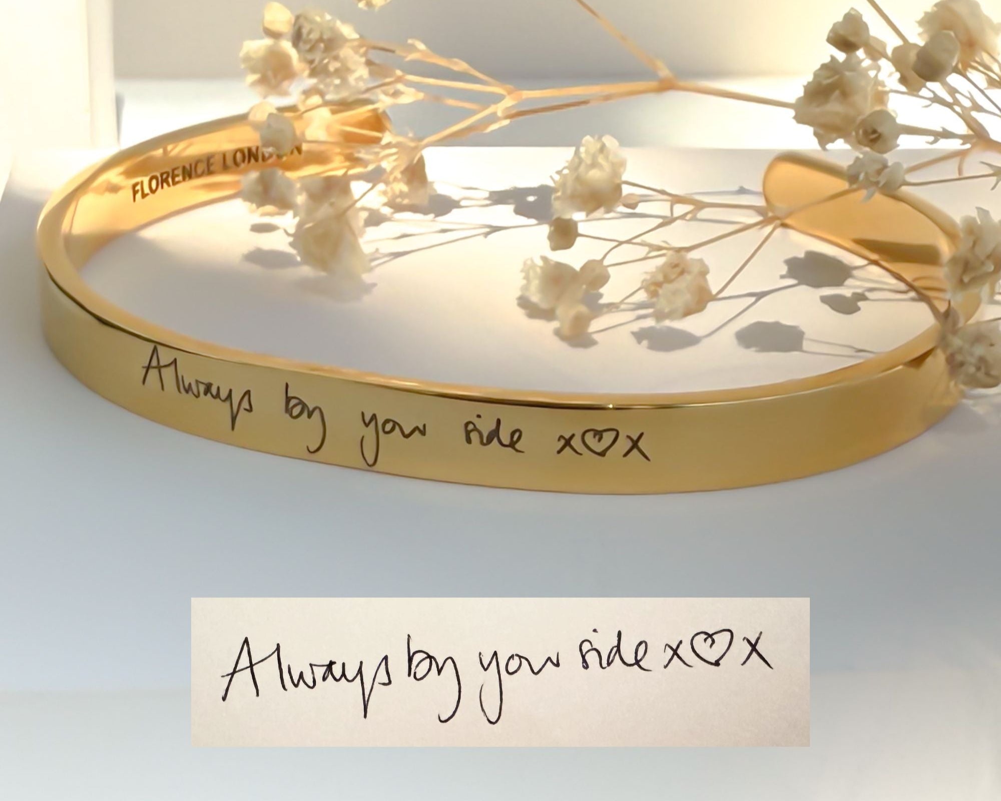 Engrave a loved ones handwriting forever with this stunning bracelet. Upload a picture of their writing from a greetings card, letter, doodle or note and we will turn your file into a beautifully engraved piece of jewellery.