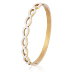 The oval-shaped bangle features clasp and hinge for ease and comfort. This bracelet looks beautiful alongside plain metal bangles and chains.