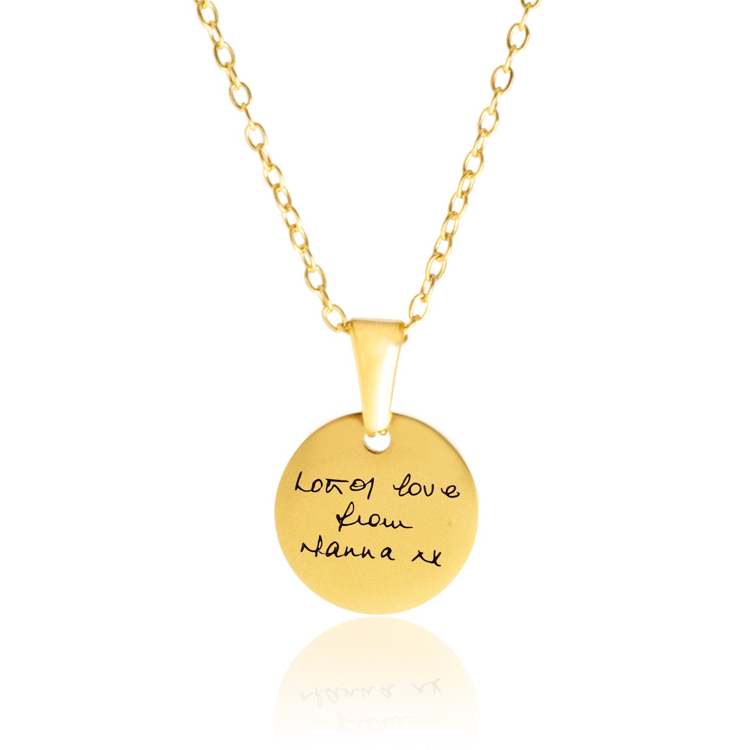 A disc-shaped necklace featuring genuine handwriting on a 43cm curb chain.