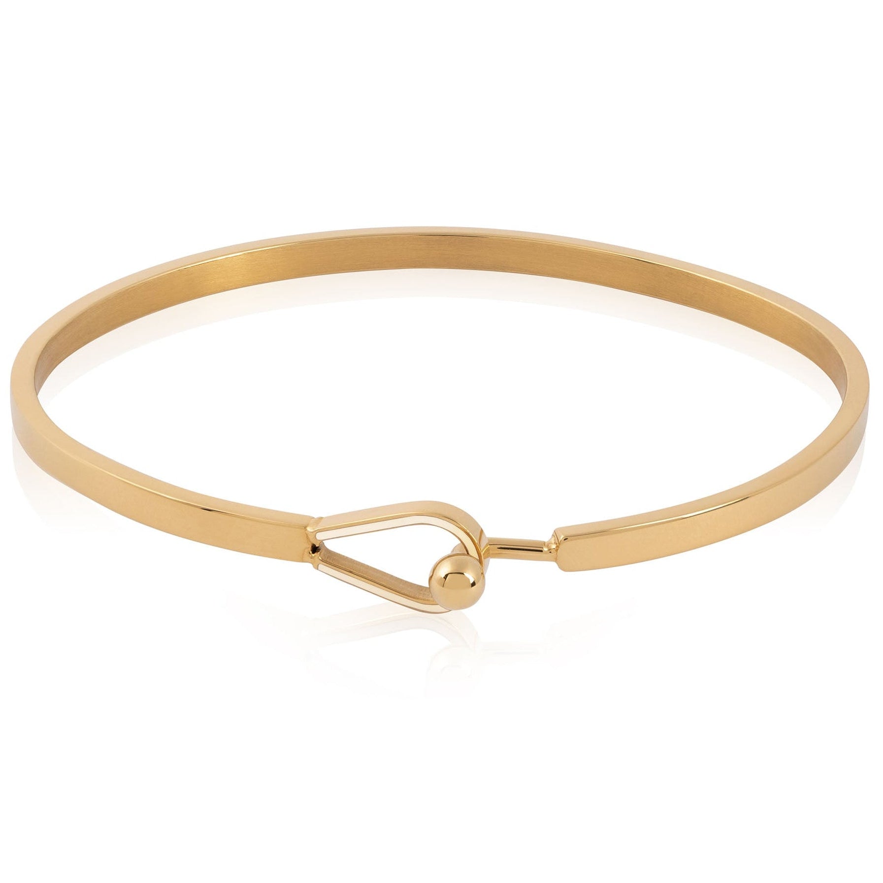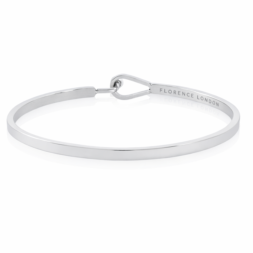 An oval-shaped, flexible bangle with a loop and hook clasp with complimentary engraving.