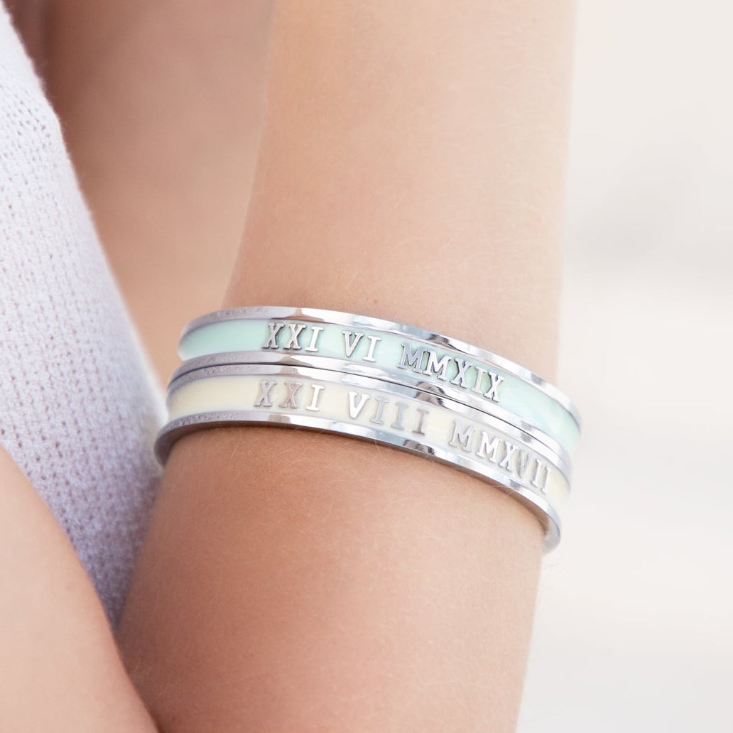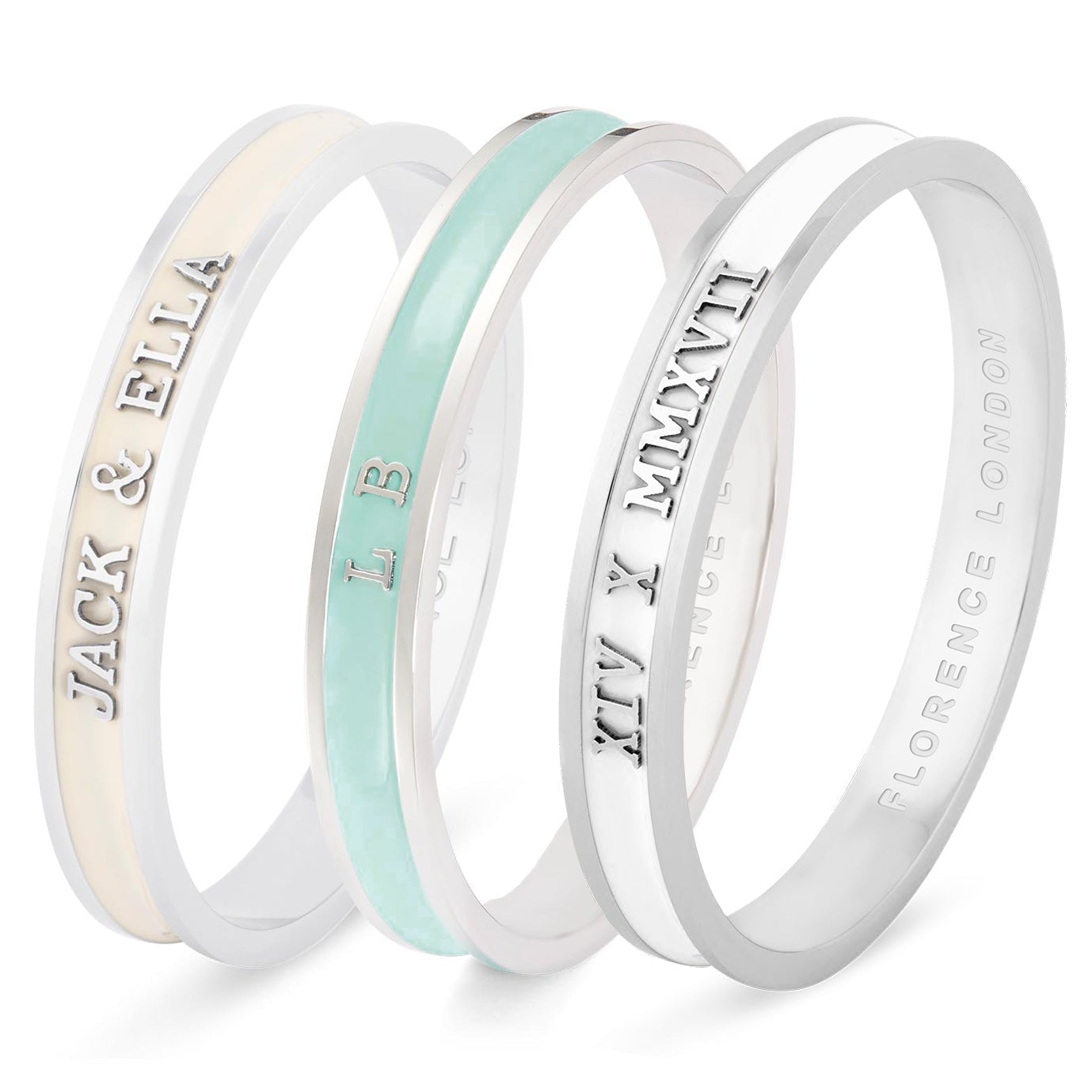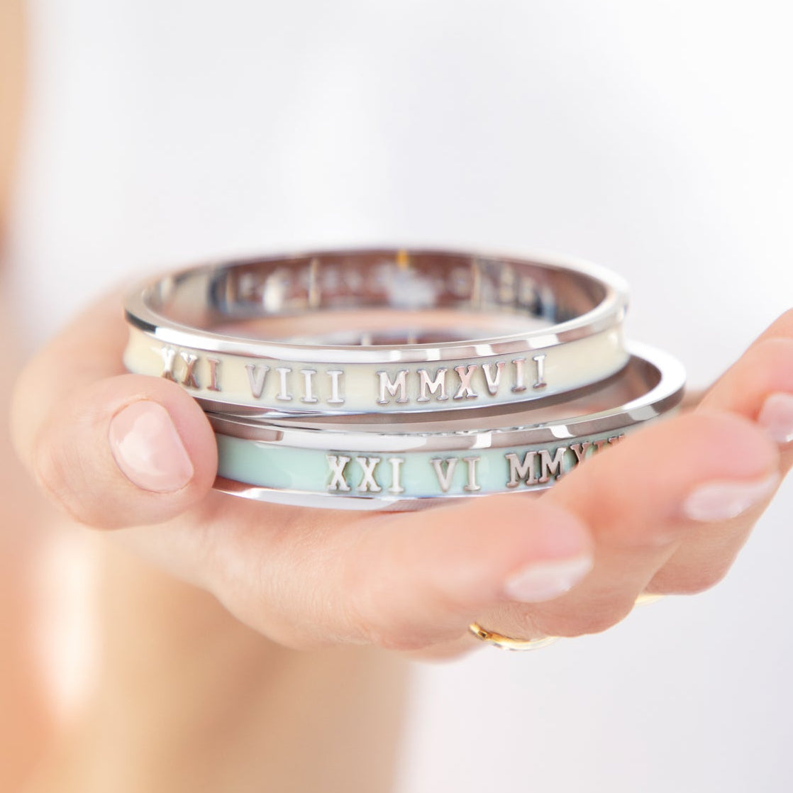 The original Florence London bangle and our best-selling piece for a reason. Our Signature Enamel Bangles are handmade to order and can be personalised with names, birthdays, anniversary dates and messages.