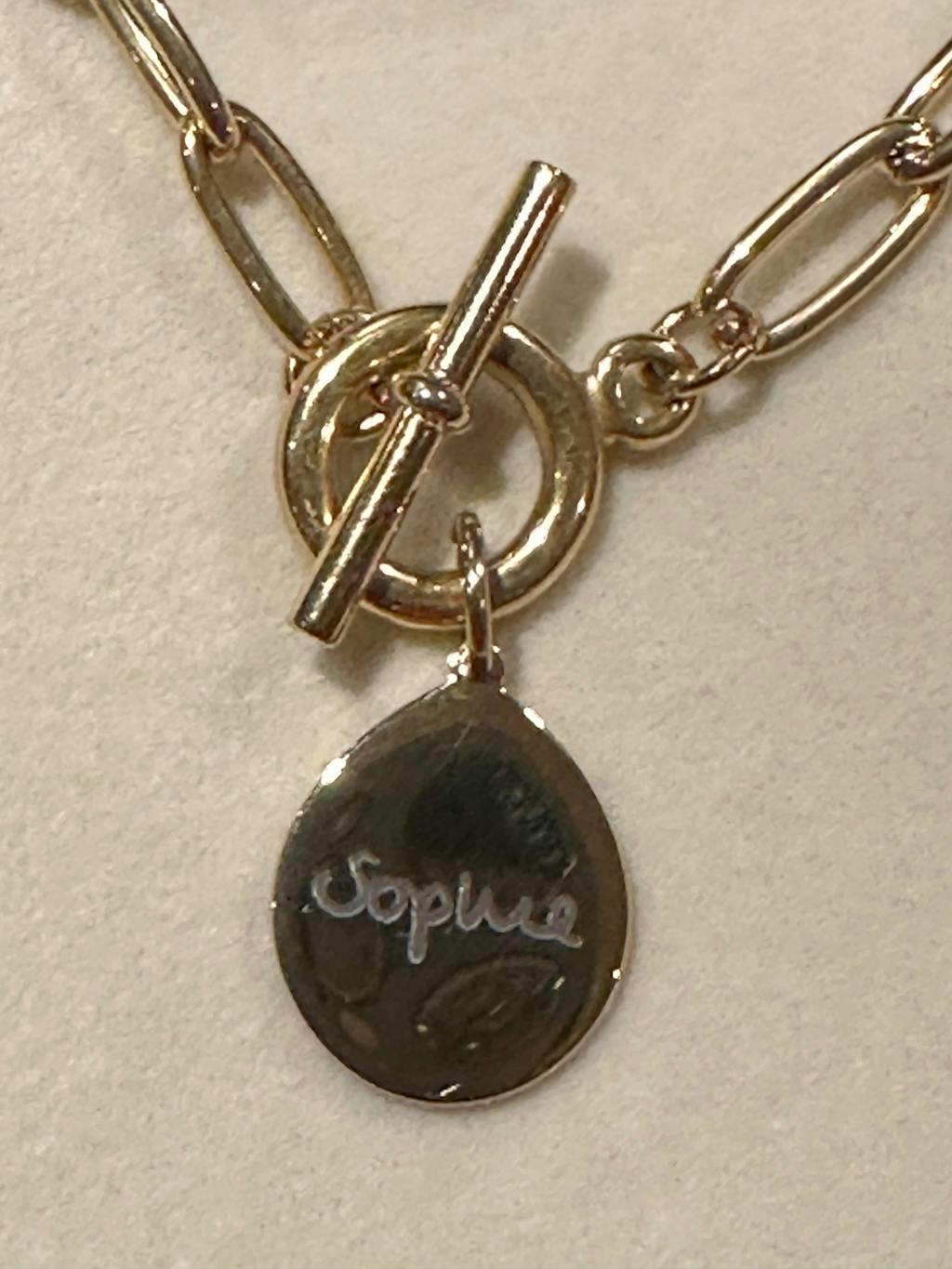 Paperclip chain with toggle and an engraved pendant available in gold or silver.
